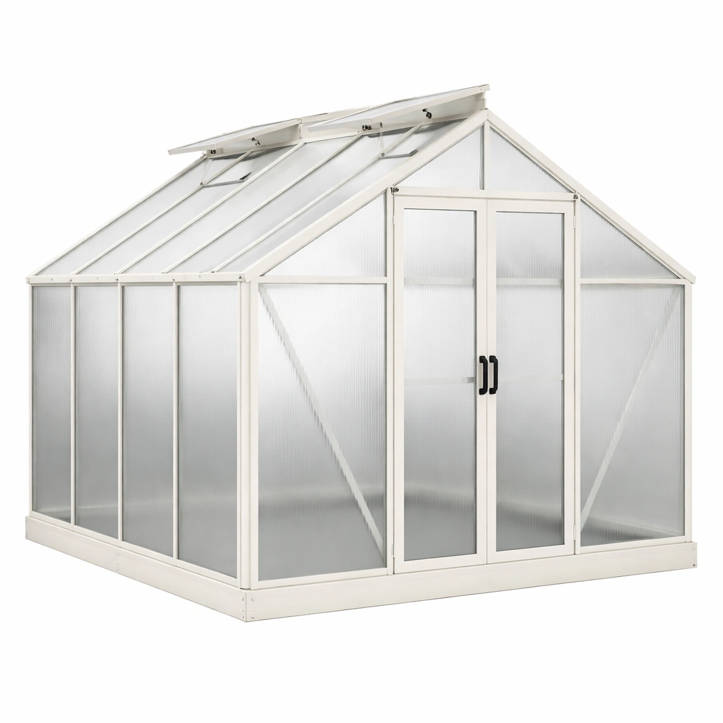 Este invernadero tiene una estructura de aluminio y paneles de policarbonato de doble pared, proporcionando un entorno adecuado para el cultivo de plantas.